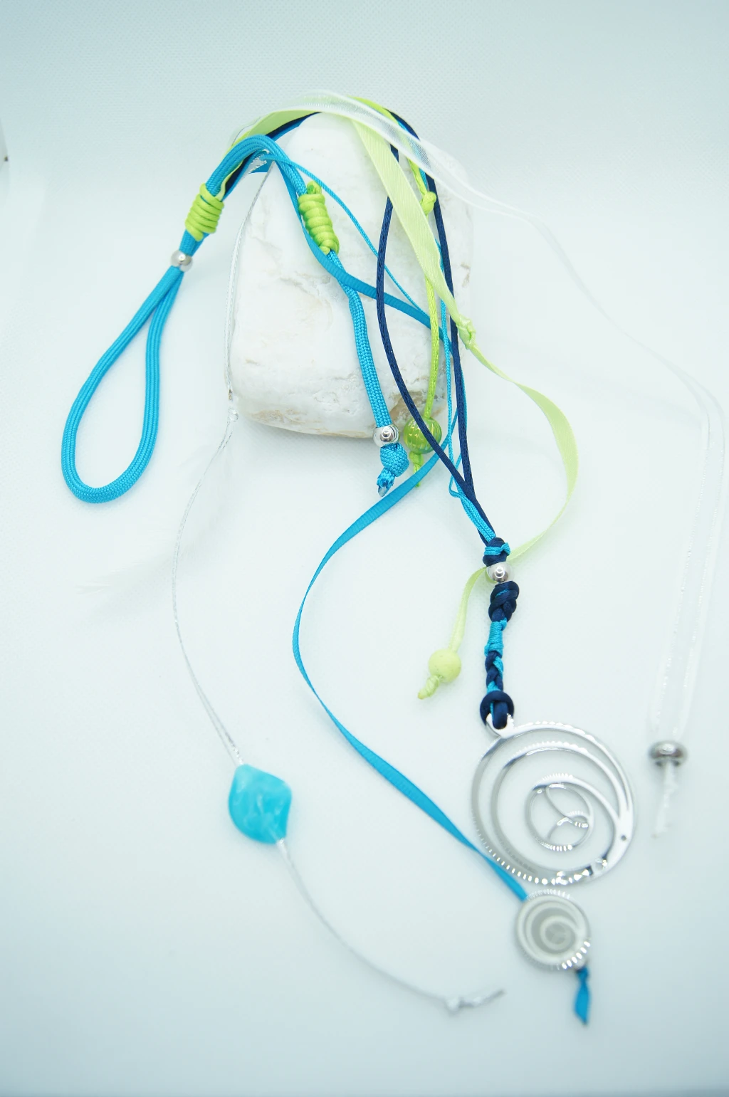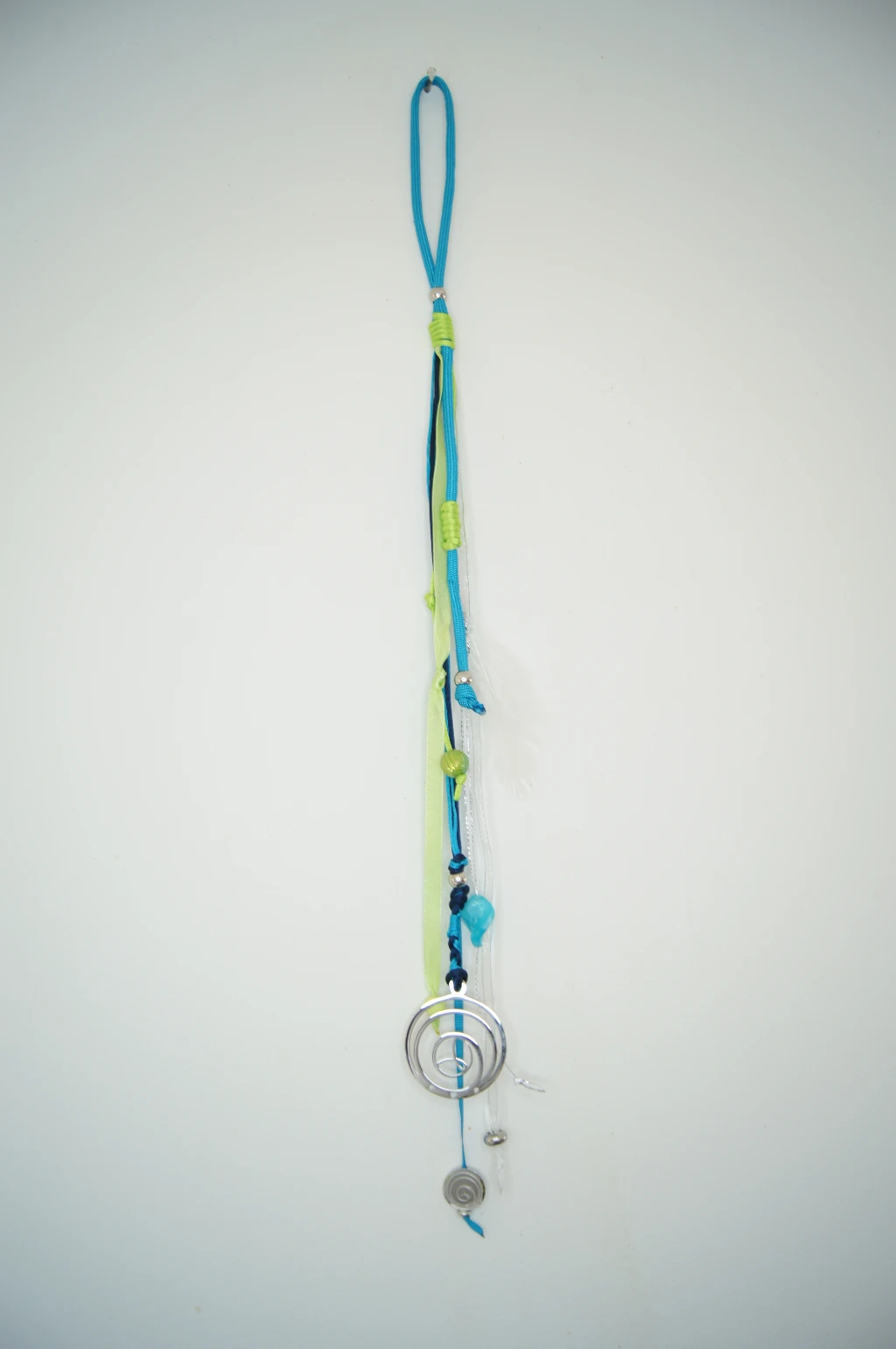- Colgante con mezcla de listones azul turquesa, verde, plata y blanco con plumas y detalles variados